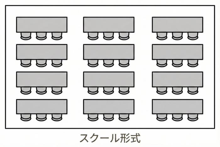 一方で、スペースが限られている場合や、議論よりも講師からの「情報のインプット」を優先したいというケースでは、スクール形式を採用することで、限られた面積でも効率よく、かつ整然と参加者を収容することができます。