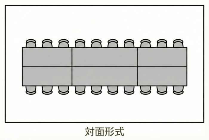 学校の教室のように、全員が前方(講師やスクリーン)を向いて着席するこのスタイルは、情報の伝達を主目的とする場において最も標準的です。