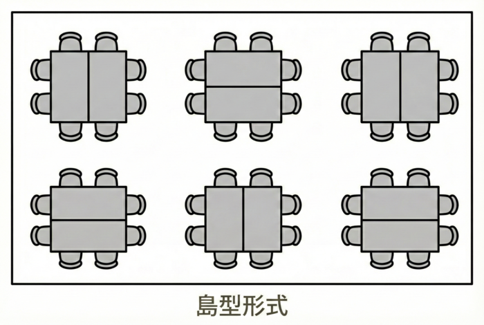 数名ずつの小さなグループを作る島型形式は、チーム内でのコミュニケーションを劇的に活性化させるレイアウトです。