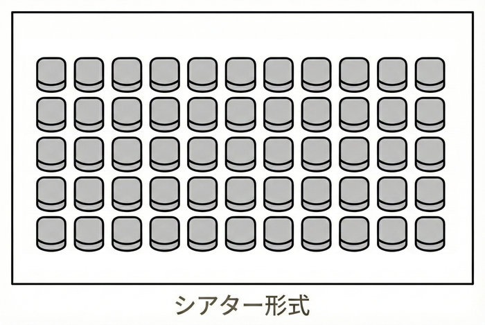 新商品の説明会や社内規定の周知など、正確な情報を効率よく届けることがゴールの場合は、視線が一点に集中するスクール形式シアター形式が王道です。