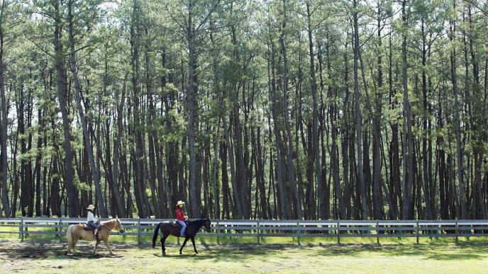 緑豊かなロケーションにある「シーガイア乗馬クラブ UMAIRU」では、初心者から楽しめる引き馬コースやミニコースを体験できます。