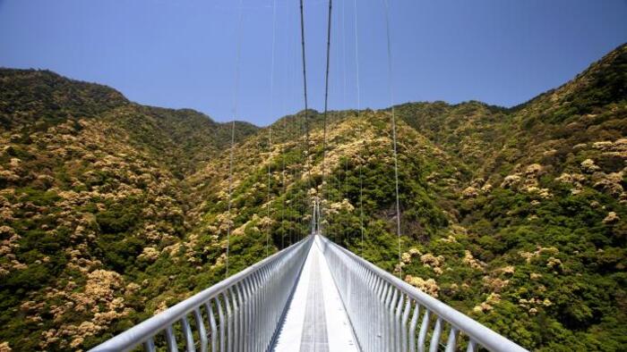 日本最大級の規模を誇る歩行者専用吊橋「綾の照葉大吊橋(てるはおおつりばし)」は、照葉樹林に囲まれた谷間に架かる人気観光スポット。